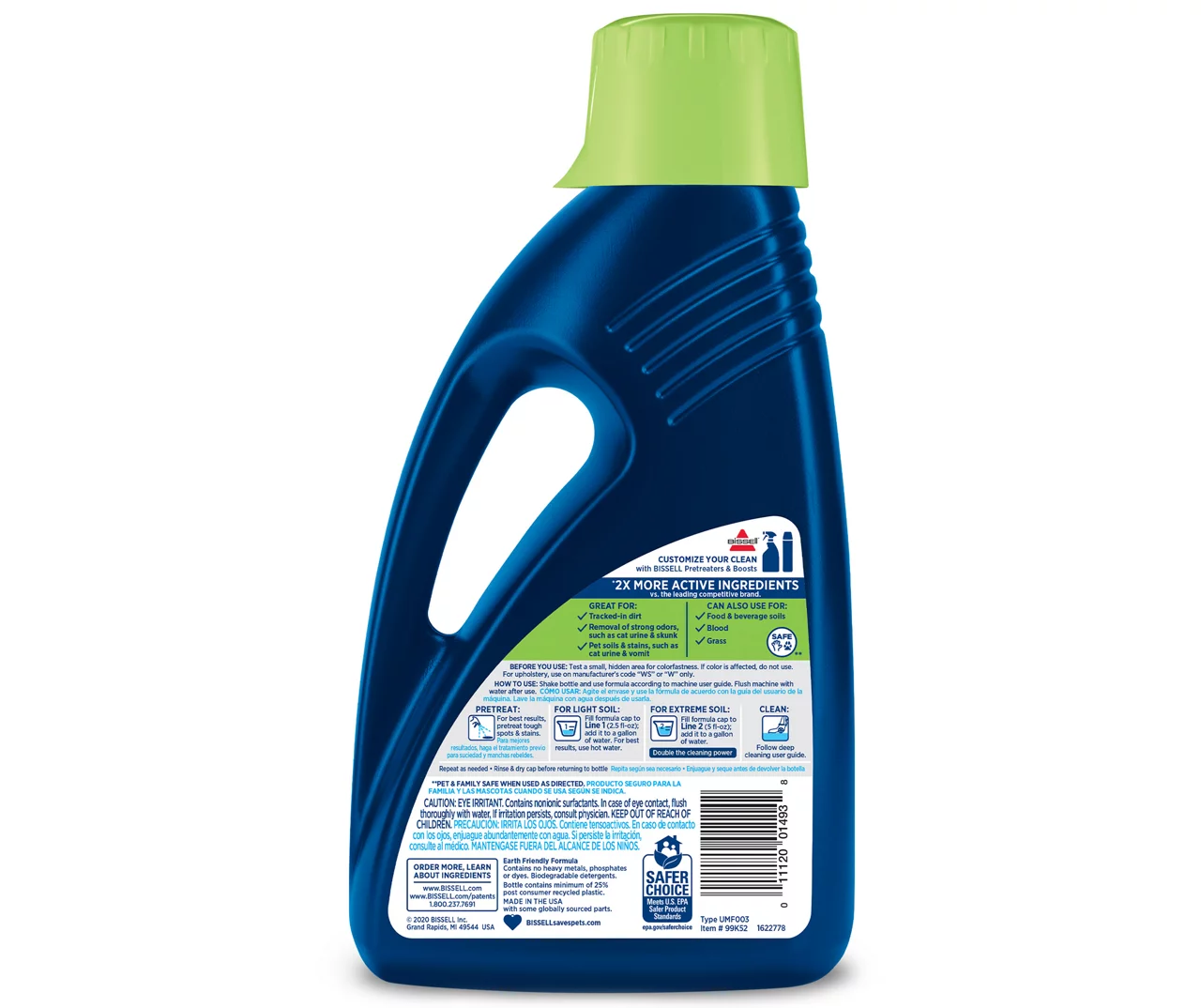 Remove pet stains and soils from carpet with patented odor control technology. The Bissell Pet Stain and Odor formula is designed to loosen and remove the stains and soils that your pet leaves behind. Since it contains odor control technology, the formula will remove odors and help prevent your pet from going back and soiling the same area again. It also helps neutralize general pet odors so that your home feels and smells fresh. It’s great for tracked-in dirt, cat and skunk urine, vomit, food and beverage spills, blood and grass stains. This formula is made for use in upright carpet cleaners.