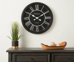 - Eye-catching black wall clock with white Roman numerals