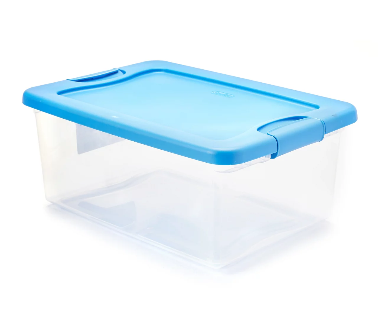 Step up your storage game with the Sterilite 6-quart latching tote, featuring a modern space saving shape and an innovativehinging lid. Simply undo one latch and lift the lid for easy access, all with one hand. The other latch stays attached and acts as a hinge, even when the lid is opened all of the way. This latching tote is ideal for storing shoes, toys, crafts and other small items around the home and fits conveniently on 16″ wire closet shelving. The recessed lid allows same-size storage boxes to stack neatly on top of each other to use vertical storage space efficiently.