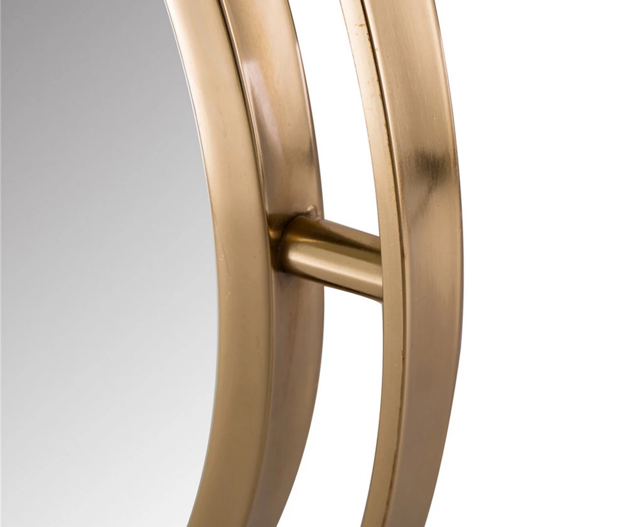 A round shape, doubled open border design and shimmering gold finish make this mirror an elegant and modern way to enhance your walls. Hanging hardware in the back ensures quick and easy installation.