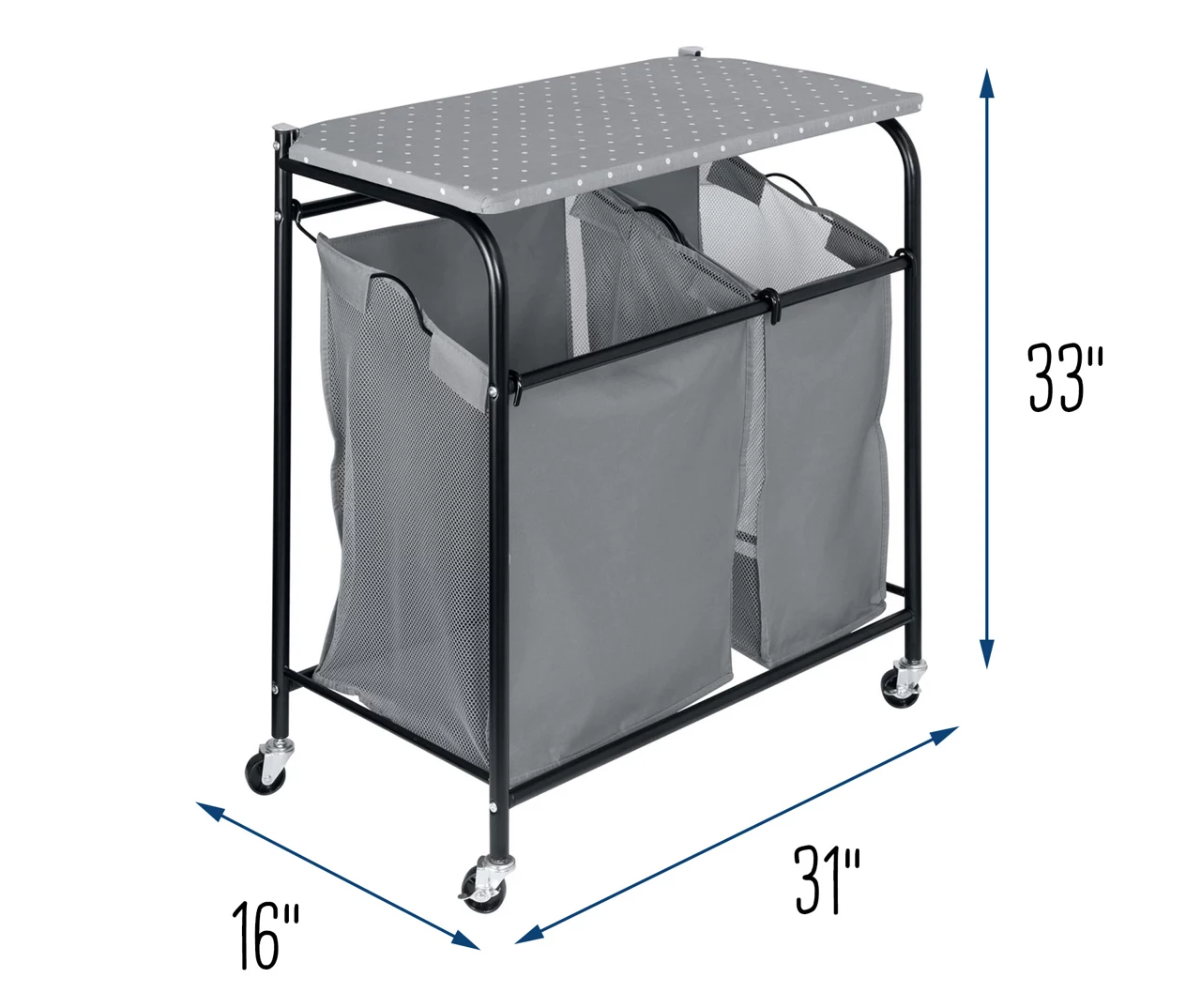 - Two differently sized hampers on the bottom make it easy to sort and store laundry