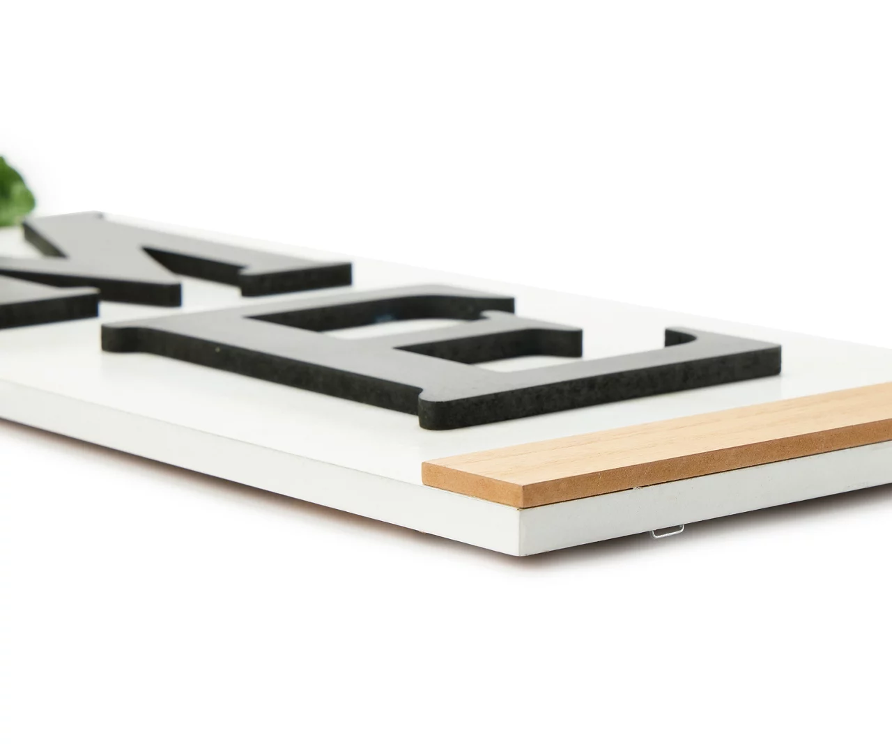 Whether you opt to lean this piece in a doorway or hang it up in a hallway, this wall plaque greets guests and family with a sweet “home” message punctuated by a leafy wreath in place of the letter O. The white background is framed by brown wood panels at the top and bottom for a polished finish.