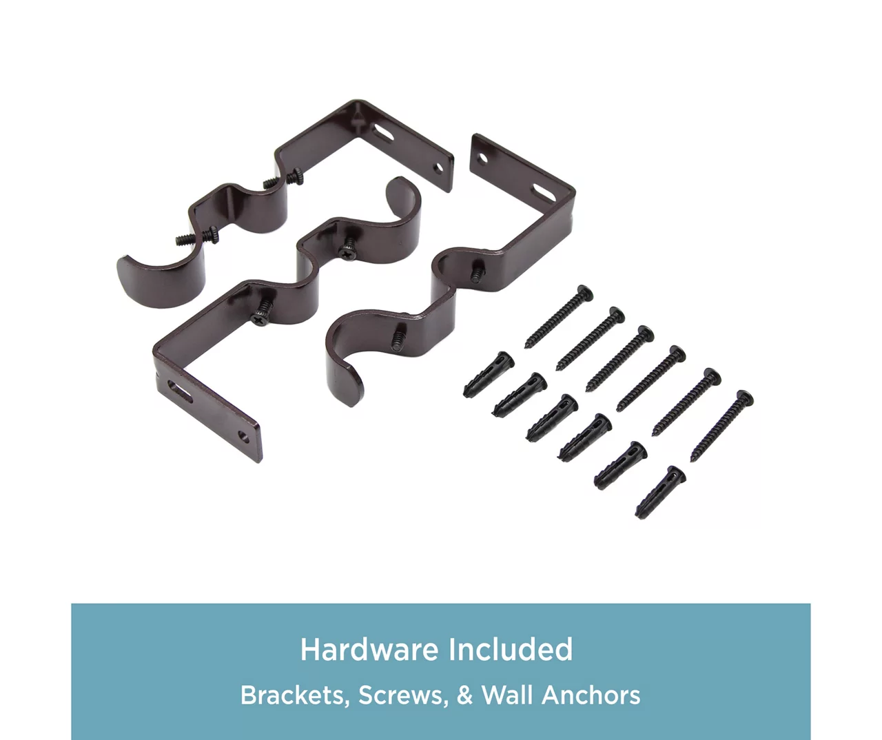 - Includes 1 telescoping double curtain rod with finials, 2 mounting brackets, 1 center support, screws, drywall anchors and installation instructions
