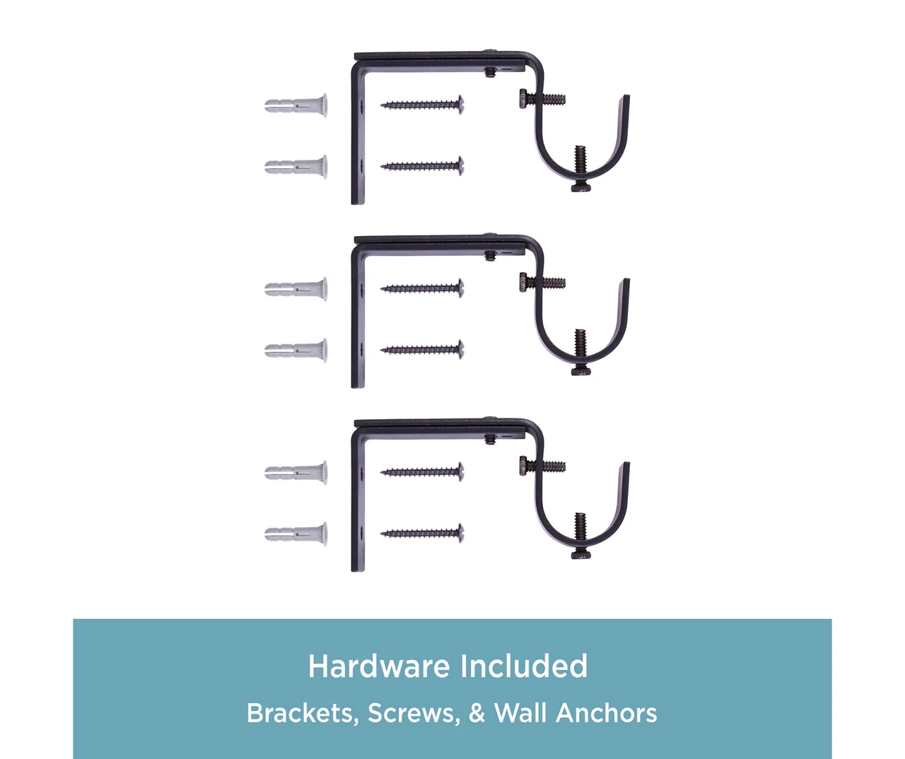 - Includes 1 telescoping curtain rod with finials, 2 brackets, 1 center support, screws, drywall anchors and installation instructions