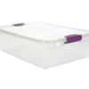 Keep your space organized with the versatile Sterilite 20-gallon latch tote. This tote is the perfect size for sports gear, off-season clothing, toys, and games, and the opaque base keeps contents out of sight. The durable construction makes this an ideal solution for storage needs in the garage, basement or attic. Indexed lids allow multiple totes to stack neatly on top of each other for efficient use of vertical storage space. Contoured end panels and robust latches make for a sure and comfortable grip when carrying.