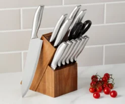 Slice, dice, cut and mince any culinary ingredient with these stainless steel kitchen knives. From serrated steak knives to a large chef’s knife, this 13-piece set includes versatile essentials for everyday food prep. Each piece is stored in the acacia wood knife block that looks stylish on a kitchen countertop.