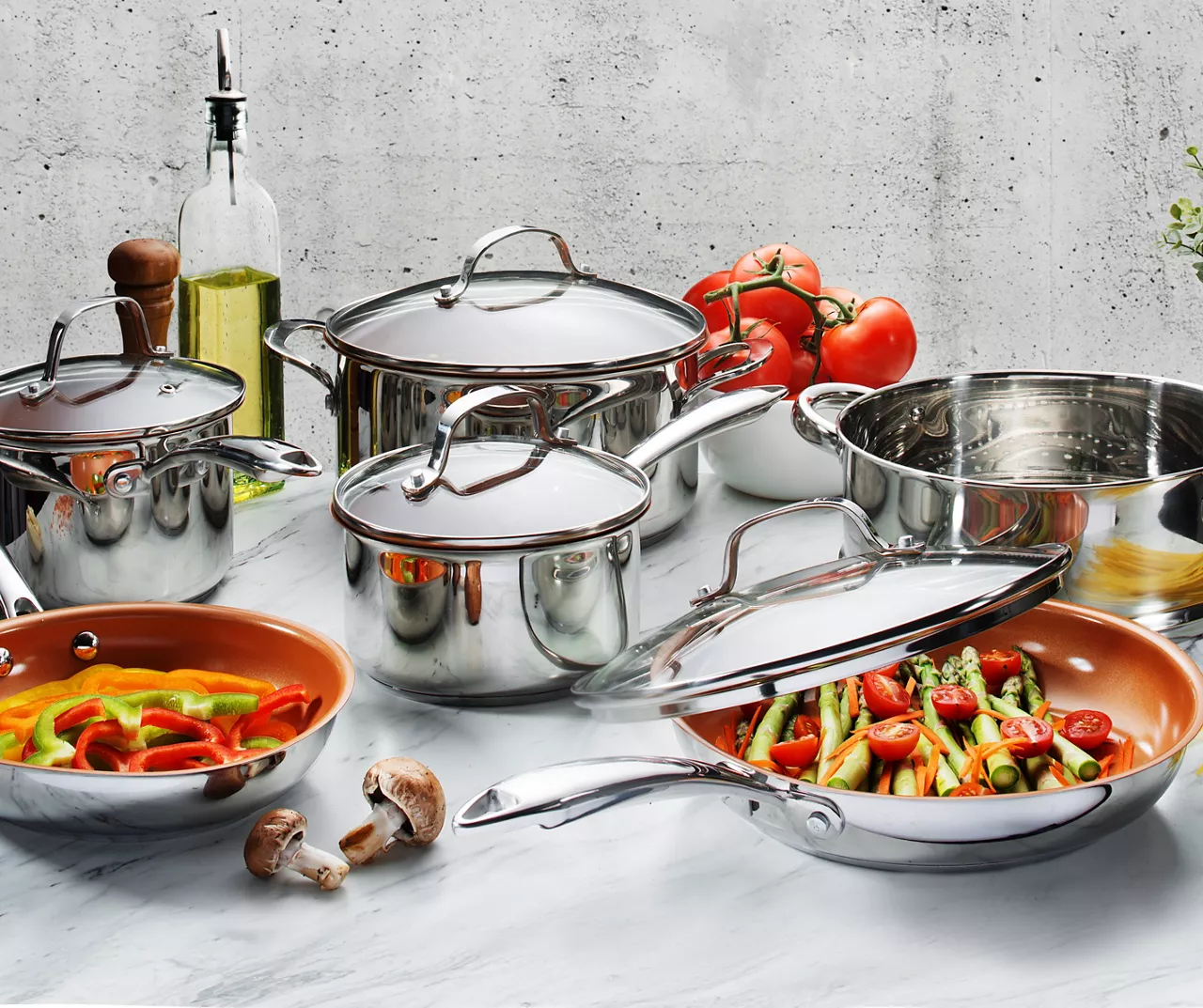 Cook, boil and sauté your way to homemade meals with this Gotham Steel 10-piece cookware set. Each piece is designed with a Ti-Cerama coating that combines super strong titanium fused with super slick ceramic for the perfect balance of non-stick and durability. Paired with tri-ply reinforced stainless steel induction bases and stay cool handles, this set easily goes in the dishwasher for easy clean up.